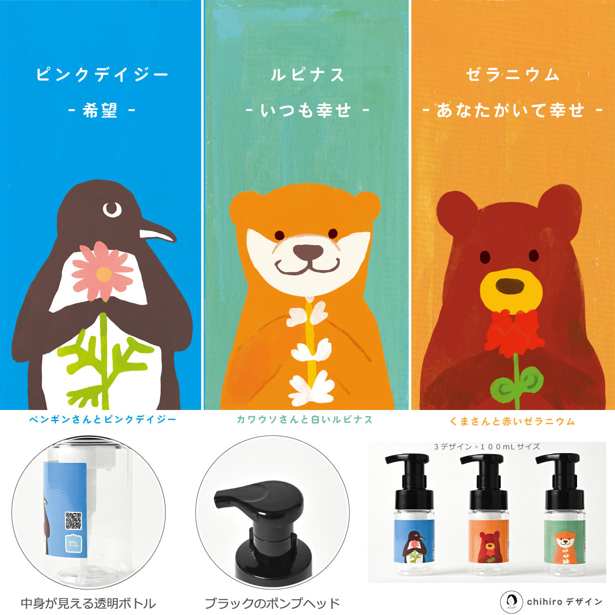【付替え用ポンプフォマー付き】泡用ポンプ容器100mL 「カワウソさんと白いルピナス(BpP10dp022_ cb)」