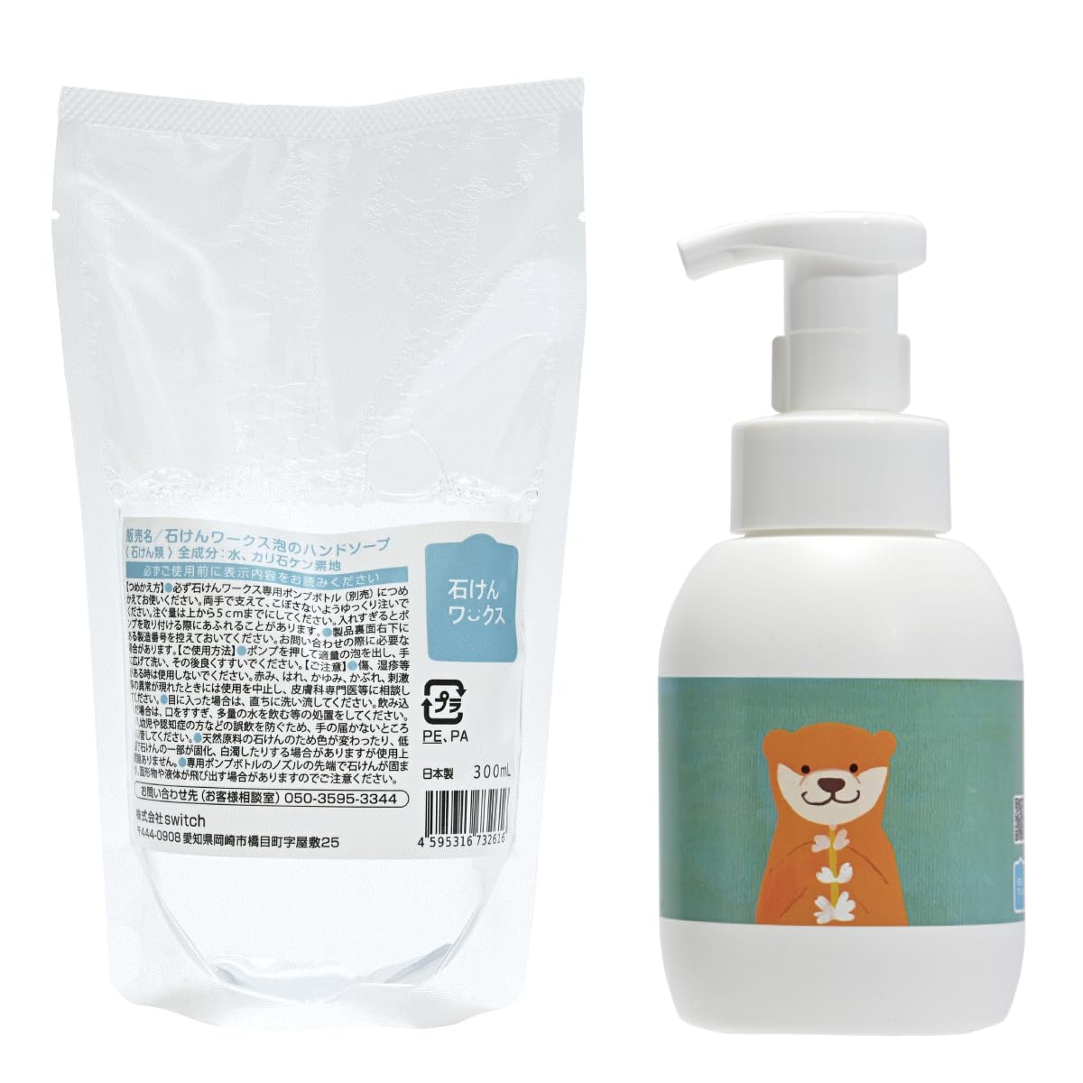 石けんワークス泡用石けんワークスのハンドソープは水とカリ石ケン素地(液体石けん)だけでできます。合成洗剤、防腐剤、増粘剤、着色料など一切の添加剤を加えていない、「無添加石けんのハンドソープ」です。香料無添加なので食材をあつかうキッチンでの手洗いにも最適です。もこもこでヌルヌルせずさっぱりとした使用感、サッと流せます。